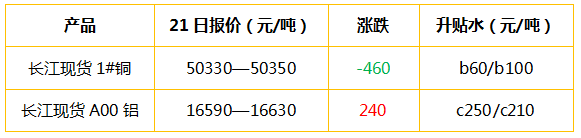 缆360点评: 9月21日期铜大幅下行,沪铜近日下跌520元/吨至50170元/吨。国内现货铜价整体成交在50180-50380元/吨,均价50280元/吨,较上一交易日跌450元/吨,升水50元/吨-升水90元/吨出货。长江现货1#铜整体成交在50330-50350元/吨,均价50340元/吨,跌460元/吨,升水60-100元/吨出货。